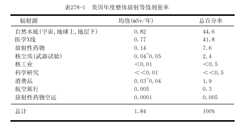 常用的测量单位是伦琴,戈瑞(Gy)和希沃特(Sv).伦琴(R)是空气中x或γ电离辐射的计量单位,戈瑞是被各组织或物质吸收的能量计量单位,它可应用于各类辐射.R和厘戈瑞(cGy)基本上是相等的.在说明生物学效应时,Sv与经质量因子校正的Gy相等.因为对一定量的能量而言,不同类型的辐射可产生不同的生物学效应;例如,中子有较大的效应.对X和γ辐射,Sv与Gy相等.在现代术语中Gy和Sv已替代拉德(rad)和雷姆(rem),Gy=100rad,Sv=100rem.在非专业刊物中常常将辐射分为低水平辐射(0.2~0.3Gy)和高水平辐射(>0.3Gy).而医学剂量一般为<0.05Gy,而且常常<0.01Gy.地球及其大气的本底放射活性水平很低,而不能测知其效应(表278-1).